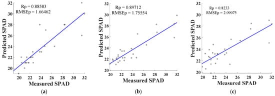 The feature bands extracted are used as input variables, and the SPAD values of lettuce leaves under cadmium stress are used as output variables to build prediction models based on support vector regression (SVR), including GA–SVR, POS–SVR, and GS–SVR. The training set and test set are divided in a ratio of 4:1. The modeling results are presented in Table 2. For the GA–SVR model, the best performance is achieved when using a sigmoid kernel function with a penalty parameter c of 6.74 and a kernel parameter g of 3.53. At this configuration, the R2 and RMSE of the training set are 0.98 and 0.27, respectively, while the Rp2 and RMSEp of the testing set are 0.77 and 1.66, respectively. In the POS–SVR model, the best performance is obtained when using a radial basis kernel function with a penalty parameter c of 5.86 and a kernel parameter g of 0.10. At this configuration, the R2 and RMSE of the training set are 0.95 and 0.71, respectively, while the Rp2 and RMSEp of the testing set are 0.75 and 1.76, respectively. In the GS–SVR model, the best performance is achieved when using a polynomial kernel function with a penalty parameter c of 4.00 and a kernel parameter g of 0.25. At this configuration, the R2 and RMSE of the training set are 0.69 and 1.77, respectively, while the Rp2 and RMSEp of the testing set are 0.66 and 2.09, respectively. For both the GA–SVR (linear kernel function) and PSO-SVR (polynomial kernel function) models, the negative Rp2 values in the testing set indicate the presence of overfitting.
