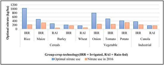 Following the determination of random and fixed effects (Table 2) and subsequent coefficient estimation (Table 3 and Table 4), the calculation of the optimal nitrate application rate, as outlined in the methodology, became feasible (Figure 1). The results of the estimated quadratic yield response functions show that rice (with 1031 (kg/ha)), onion (with 800 (kg/ha)), and tomato (with 508 (kg/ha)) have the largest usage of nitrogen at the optimal point, and rain-fed wheat (with 168 (kg/ha)) and rain-fed canola (with 171 (kg/ha)) have the smallest. Figure 1 shows that across all crops, the optimal nitrate use exceeds the observed application rates in 2016. This discrepancy is more evident in rice in Iran. The lower-than-optimal nitrate use for rice in the north of Iran can be influenced by specific soil types prevalent in the region. Factors such as the presence of alluvial, clayey, or coastal soils may contribute to suboptimal nitrogen application. Limited awareness of soil characteristics, inadequate soil testing, and inefficient nitrogen management practices may further contribute to the disparity between actual and optimal nitrate use.