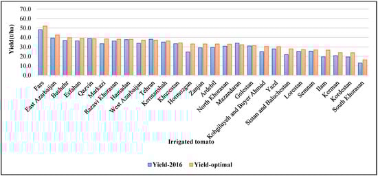Optimal and observed 2016 regional yield distribution of irrigated tomato in Iran.