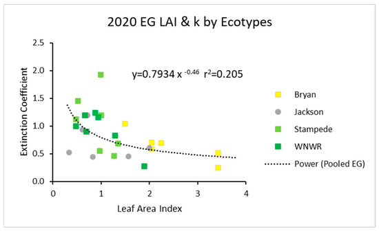 For 2020, the light extinction coefficient (k) values as a function of LAI for five ecotypes. Values of k are actually negative, but were converted for this figure. Power (Pooled EG) is the power function derived using all ecotypes from 2020.