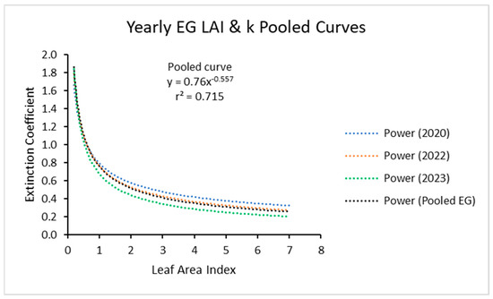 Light extinction coefficient (k) values as a function of LAI with 2020, 2022, and 2023 data and with the three curves compared. Values of k are actually negative but were converted for this figure. Power (Pooled EG) is the power function derived using all ecotypes from all years.