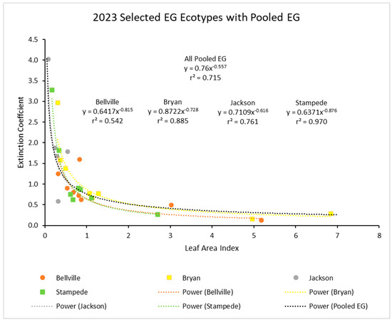 For 2023, the light extinction coefficient (k) values as a function of LAI for several ecotypes. Values of k are actually negative, but were converted for this figure. Power (Pooled EG) is the power function derived using all ecotypes from 2023.