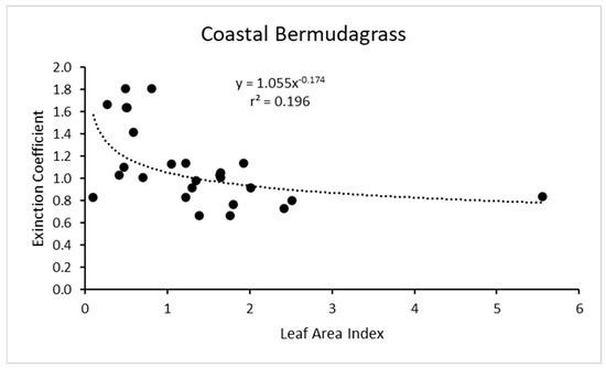 Re-examining the results for coastal bermudagrass [16] (the most common hay grass in the southern U.S.) showed a power function increase in k with reduced LAI, but the r2 value was only about 0.2 (Figure 6). This is interesting because this is one of two of the only other grass species that we have found that has a similar shaped response function for k as a function of LAI. In addition, the importance of coastal bermudagrass for grazing and hay production in the southern U.S. makes its accurate modeling especially relevant.