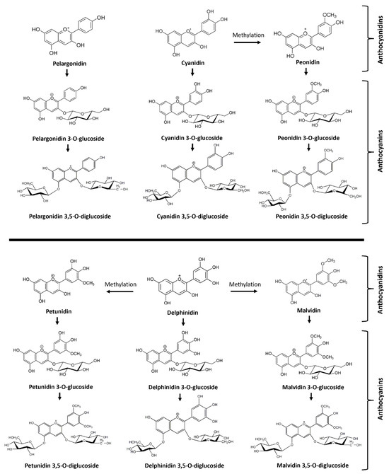 Anthocyanins are the main active nutraceuticals in muscadine berries, which provide antioxidative and other health values [4,5,6,7]. To date, anthocyanins have been analyzed in intensive studies in a number of muscadine cultivars. The first anthocyanin molecule isolated from muscadine berries of the Hunt cultivar was named muscadinin (3,5-diglycosidyl-3′-O-methyldelphinidin, namely petunidin 3, 5-diglucoside) by W.L. Brown in 1940 [1]. The main anthocyanins were then identified from berries and other tissues [8,9,10,11,12,13]. The most common muscadine anthocyanidins are delphinidin, malvidin, petunidin, cyanidin, pelargonidin, and peonidin (Figure 1).