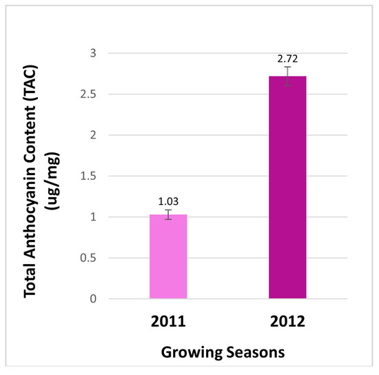 Total anthocyanin contents in berries. Anthocyanins were measured to compare the effects of two cropping seasons on the total anthocyanin content (TAC) in berries from the field. The resulting data revealed that the contents of anthocyanin were 2.64-fold higher in berries of 2012 than those in 2011 (Figure 2). This result indicates that the production of total anthocyanins is regulated by two different growth seasons. This result is a common phenomenon, given that the biosynthesis of anthocyanins is highly regulated by different environmental conditions. Light conditions and temperatures are two main environmental factors that have been demonstrated to tightly control anthocyanin biosynthesis in plant tissues [20,23,24,25,26]. Since there was no significant difference between the annual averages of high temperature and the maximum highest temperature values of 2011 and 2012 in the cultivation area, this finding may suggest that besides temperature, factors such as the intensity of sunlight, wavelengths, polarization degree and direction, humidity, and wind may play a role in the 2.64-fold increase in total anthocyanin content. These factors may also have impacts on the profile of anthocyanin types of the same cultivar growing in two consecutive years.
