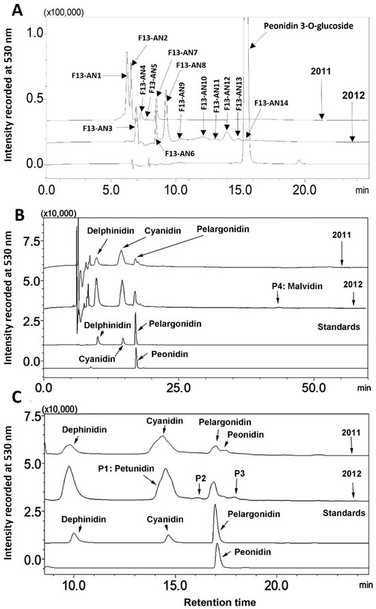 Comparison of anthocyanin and anthocyanidin profiles in berries of FLH 13-11 harvested in the 2011 and 2012 cropping seasons. (A) Comparison of anthocyanin profiles in berries from 2011 and 2012; (B) anthocyanidin profiles released from the hydrolysis of anthocyanins in 2011 and 2012; (C) four anthocyanidin standards.