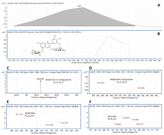 Extracted ion chromatogram (EIC) of primary mass spectrum and m/z features of secondary ion fragments derived from LC-MC/MS of peak F13-AN6. These data annotate this peak to be delphinidin 3, 5-digluoside (Del-3,5-dG, molecular weight: 427.528). (A) EIC of primary ion 643.2791 [m/z]−, [M + 18 − 2H], (B) enhanced charge capacity (ECC) ion product for 643.2791 [m/z]−, (C) an MS profile showing an extracted m/z value, 643.2791 [m/z]−, [M + 18 − 2H], (D–F) fragments from CID of 643.2791 showing 463.1951 and 464.1953 [m/z]− relating to Del-3-G (D), 300.111, 301.1212, and 302.1213 [m/z]− relating to delphinidin aglycone (E), and 163.0963–168.1047 relating to glucose (F). Red “◊”: the primary mass spectrum of the compound; “**”: fragments derived from the primary mass spectrum. CID: collision induced disassociation. Cpd: compound database.