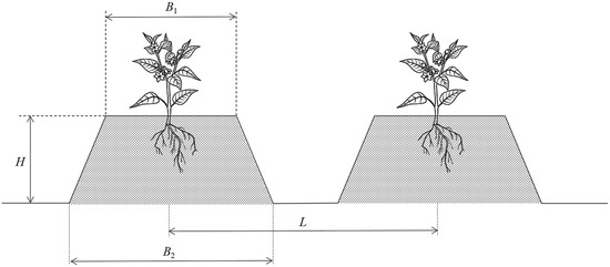 Cross-sectional view of chili pepper ridging. H is the compressed ridge height, mm; B1 is the ridge top width, mm; B2 is the ridge base width, mm; L is the center distance between two rows of ridges, mm.