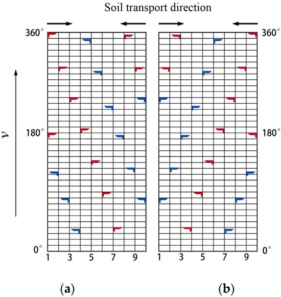Schematic diagram of planar arrangement of rotary tillage blades. (a) Left rotary tillage blade assembly. (b) Right rotary tillage blade assembly. The red represents the rotary tillage blades that face towards the inside of the machine, while the blue represents the rotary tillage blades that face towards the outside of the machine.