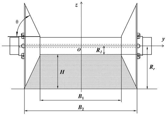 The loosened soil at the front end needs to be compacted by the stemming roller group to form ridges with a trapezoidal cross-section. In the operation process, the shape of the ridges is determined by the external parameters of the stemming roller group. To ensure the compact and shaped formation of the ridges after a single operation cycle, the working surface of the stemming roller group must be consistent with the shape of the ridges. As shown in Figure 5, with the center of the stemming roller group as the coordinate origin, a three-dimensional Cartesian coordinate system is established. Based on the specified agricultural requirements for creating ridges for chili pepper cultivation, the design of the stemming roller group incorporates the following dimensions: the ridge height H = 228 mm, the top width B1 = 545 mm, the bottom width B2 = 755 mm, the rotating radius of the stemming disc Rr = 285 mm, the radius of the pressing roller R1 = 57 mm, and the cone surface angle θ = 64°.