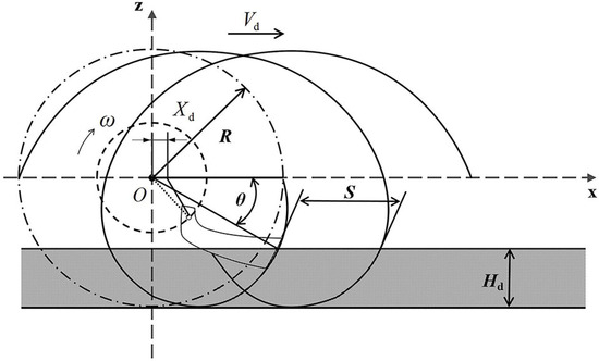The cutting pitch S refers to the distance of the rotary tillage device advancement within the time interval of the rotary tillage knives cutting the soil successively, which has a large influence on the degree of soil fragmentation in this part [30]. If the cutting pitch is too large, the thickness of soil cut by two neighboring rotary knives in the longitudinal plane along the forward direction of the rotary tillage device will also increase, and the principle of rotary tillage knife movement is shown in Figure 7.