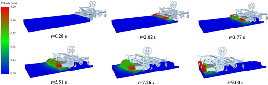 Figure 9 illustrates the different stages of the coupled simulation of the rotary tillage and ridging process. Prior to 3.77 s, the machine was in the soil penetration stage. Between 5.5 s and 9 s, the machine completely entered the soil trough, initiating the formal rotary tillage and ridging process, during which the machine operated steadily. At the 9 s mark, the machine was about to exit the soil trough, signifying the completion of the rotary tillage and ridging operation and concluding the coupled simulation.