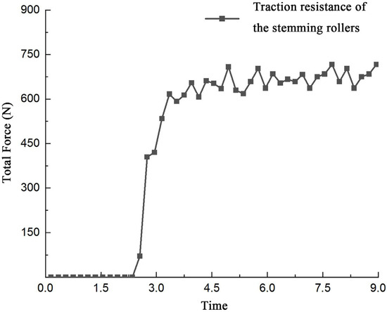 Figure 10 illustrates the variation in the traction resistance of the stemming roller group during the rotary tillage and ridge formation process. From 0 s to 2.6 s, the machine slowly enters the furrow. At 2.6 s, the stemming roller group begins to make contact with the soil. From 2.6 s to 5.2 s, the traction resistance of the stemming roller group continues to increase. During the period of 5.21 s to 9.0 s, the rotary tillage and ridging process officially commences, with the traction resistance of the stemming roller group exhibiting fluctuation within a relatively stable range.