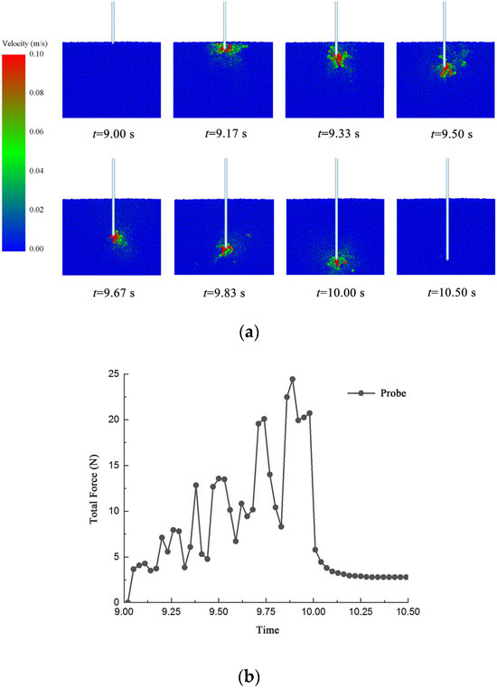 After the rotary tillage and ridging simulation operation, in order to detect the soil firmness of the ridge body, a point 2400 mm away from the boundary of the soil groove was selected as the detection object in the stable area of the operation, and the soil firmness probe model was imported, so that the top of the probe was flush with the top surface of the ridge body. The probe moved in the direction of gravity at a speed of 180 mm/s for 1.00 s, and the probe stopped moving, as shown in Figure 11. At 10.5 s, the soil particles in the monopoly were not disturbed and the force on the probe tended to be constant. Measurements were made on the monopoly probe and the soil firmness was calculated as follows: