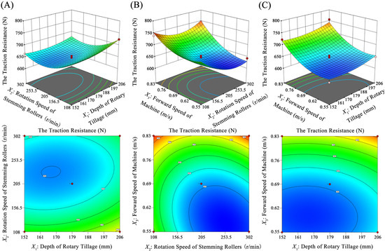 Figure 12 shows the interactive effects on the traction resistance of the stemming roller group. In Figure 12A, with a constant rotary tillage depth, the traction resistance initially decreases and then increases with increasing stemming roller speed, with an optimal range of 205–302 r/min. When the stemming roller speed is constant, the traction resistance decreases and then increases with increasing rotary tillage depth, with an optimal range of 170–188 mm. In Figure 12B, with a constant stemming roller speed, the traction resistance increases with increasing machine forward speed, with an optimal range of 0.55–0.69 m/s. When the machine forward speed is constant, the traction resistance initially decreases and then increases with increasing stemming roller speed, with an optimal range of 205–302 r/min. In Figure 12C, with a constant rotary tillage depth, the traction resistance increases with increasing machine forward speed, with an optimal range of 0.55–0.69 m/s. When the machine forward speed is constant, the traction resistance increases with increasing rotary tillage depth, with an optimal range of 152–188 mm.