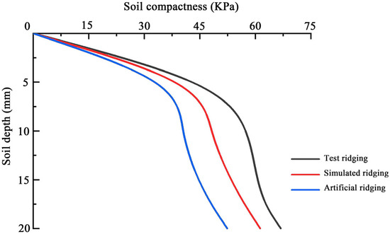 Figure 15 presents the variation curves of soil compactness after manual ridge formation, simulated ridge formation, and experimental ridge formation. The soil compactness after simulated and experimental ridge formation is higher than that after manual ridge formation. Specifically, the soil compactness in the experimental ridge formation is on average 10.83% higher than that in the simulated ridge formation, which is nearly comparable to the simulated values.