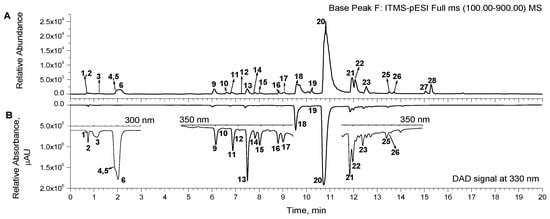 Representative UHPLC chromatogram of methanol extract, recorded from MS signal and ranged by base peak (A) and DAD-signal at 330 nm (B). Additionally, for better visibility of the peaks, three insets show enlarged parts of the chromatogram at 300 nm (0–3 min), 350 nm (4.5–9.4 min), and 350 nm (11.5–15 min) (B). The numbers marking the peaks are in accord with the numbering of the corresponding detected compounds in Table 1.