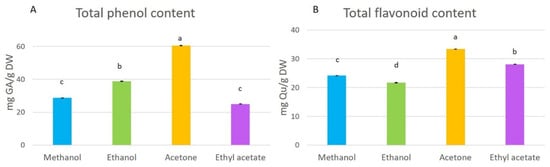 Total phenol (A) and flavonoid (B) contents in methanol, ethanol, acetone, and ethyl-acetate extracts. Presented results are means ± SD. Different letters above the means represent significant difference by Tukey HSD post hoc test (p < 0.05).