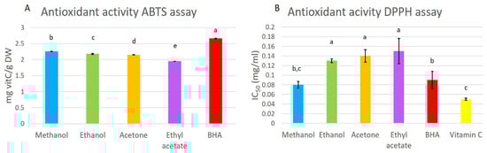 Antioxidant activity, measured by the ABTS (A) and DPPH (B) methods in methanol, ethanol, acetone, and ethyl-acetate extracts. The antioxidant activity was compared to that of butylated hydroxyanisole (BHA) and vitamin C as standards. Presented results are means ± SD. Different letters above the means represent significant difference following Tukey HSD post hoc test (p < 0.05).