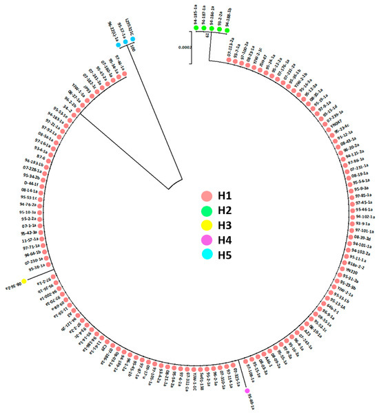 Based on the AvrPi54 gene sequences of 142 P. oryzae isolates, the evolutionary history was inferred using the Neighbor-Joining method in Mega 7.0 software. NJ tree was constructed under 1000 bootstrap replications (Figure 4). Isolates marked in a red circle belonged to haplotype H1 and gathered in a clade. Isolates marked in a yellow circle (belonging to H3) and marked purple circle (belonging to H4) were mixed in the clade. Isolates marked in a green circle were clustered into a clade belonging to haplotype H2. And isolates marked in a blue circle were formed into another clade belonging to haplotype H5. According to the NJ tree, H1 was more closely related to H2, H3 and H4 than to H5. The results were consistent with the haplotype network.