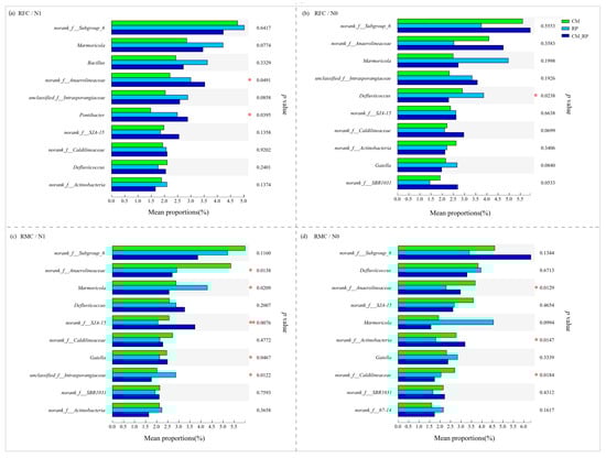 Comparative analysis of the bacterial community at genus level in soils with different cultivation systems (subgraph (a): rice–fish coculture soil with N addition; (b): rice–fish coculture soil without N addition; (c): rice monoculture soil with N addition; (d): rice monoculture soil without N addition; legend CM: single cropping of Astragalus sinicus; RP: single cropping of Brassica napus; CM_RP: intercropping of A. sinicus L. and B. napus L.; *, p ≤ 0.05; **, p ≤ 0.01).