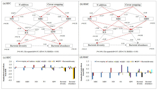 To elucidate the effects of N addition and cover cropping treatments on plant growth and soil bacterial diversity, structural equation modeling (SEM) was employed. The pathways involving soil bacterial abundance and diversity, R/S, and shoot dry weight (SDW) responding to N addition and cover cropping treatments differed between the RFC and RMC systems (Figure 4a,b). Notably, the intercropping treatment exhibited a more pronounced effect on soil MBC, MBN, NIN, plant R/S, and SDW, as well as soil bacterial diversity and abundance compared to the N addition treatment. These findings aligned with the results obtained from the analysis of variance (ANOVA) (Table 1). Moreover, the standardized total effect values for cover cropping on the SDW were 0.743 and 0.794 in the RFC and RMC systems, respectively. In contrast, the effect values for N addition on the SDW were −0.215 and 0.108 in the two systems, respectively (Figure 4c,d), indicating that plant aboveground growth responded more significantly to the cover cropping treatment than to N addition in both systems.