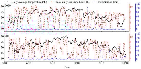 The field experiment was conducted in Bayi Town, Sujiatun District, Shenyang City, Liaoning Province, from 2020 to 2021 (E: 123.18°, N: 41.49°) in the experimental field of the LRRI. The region has a temperate humid continental climate and has been a long-term single season and single-cropping area for rice. It is a medium- and high-yield field production area in the region, and the soil type is loam. The sunshine, rainfall, and temperature data for the test area are shown in Figure 1. Each treatment was repeated three times, totaling 18 plots, with a test plot of width 6 m and length 10 m, a plot area of 60 m2, and randomly arranged, mechanized transplanting. The initial pH of the soil was 6.2, and the contents of alkali-hydrolyzable N, available phosphorus, and available potassium were 94.6 mg/kg, 54.7 mg/kg, and 91.4 mg/kg, respectively. The silicon content was 27.8% (silicon-deficient land). Meteorological data of the experimental area are shown in Figure 1. Local farming modes (FMs) were used as a control, and a conventional densification treatment (DM), a densification with reduced N (−20%) treatment (DLM), and three densifications with reduced N (−20%) and base silicon fertilizer treatments (low fertilizer: DLMS1, medium fertilizer: DLMS2, high fertilizer: DLMS3) were set up (Table 1). In the reduced N treatments, the total N fertilizer application amount was reduced by 20% during the base fertilizer period, and the silicon fertilizer was bio-organic silicon (27% granular silicon fertilizer with an algal source extract of reproductive organs and tender tissues. This bio-organic silicon can break down and release silicon ions into the soil water solution, and be absorbed by the rice roots; Anhui Nongwang Agricultural Technology Co., Ltd., Hefei, China).