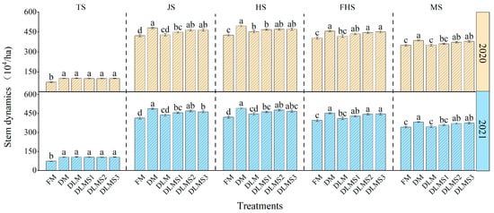 Dynamics of rice stems. Different letters of the same growth stage indicated significant differences in the same year (p < 0.05).