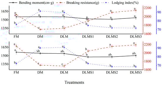 The mechanical strength and growth structure of plants were affected by agronomic traits and the fourth internode physical traits and physiological characteristics, and the lodging traits of the plants also changed. The lodging traits of the fourth internode in rice are a comprehensive expression of both the physical and physiological characteristics of the plants. The lodging traits of the fourth internode in rice were measured and analyzed 40 days after the heading stage (Figure 3), and the changes in lodging traits were consistent among the different treatments throughout the year. The bending moment of the FM treatment was the highest, which was related to the formation of strong stems and relatively large panicles with low planting density. With a reduction in N fertilizer application and an increase in planting density, individual stems became thinner, leading to a sharp decrease in breaking resistance. After the application of silicon fertilizer, stem breaking resistance significantly (p < 0.05) increased with increasing application rate. The DM and DLM treatments had the lowest bending resistance, while the DLMS3 treatment had the highest bending resistance, which increased by 440.1 g and 503.8 g, respectively, compared to the lowest values in the DM treatment over the 2 years.