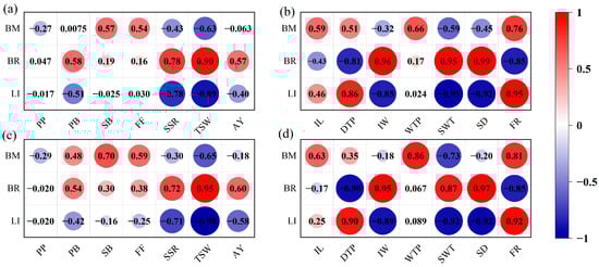 Correlation analysis between the lodging traits of rice stems and yield, its constituent factors, and internode morphology. (a) correlation between the lodging traits of rice stems and yield, its constituent factors in 2020, (b) correlation between the lodging traits of rice stems and internode morphology in 2020, (c) correlation between the lodging traits of rice stems and yield, its constituent factors in 2021 (d) correlation between the lodging traits of rice stems and internode morphology in 2021.