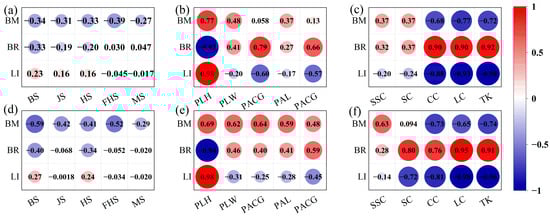 Correlation between the lodging traits of rice stems and population structure, panicle morphology, and stem physiological characteristics. (a) correlation between the lodging traits of rice stems and population structure in 2020, (b) correlation between the lodging traits of rice stems and panicle morphology in 2020, (c) correlation between the lodging traits of rice stems and stem physiological characteristics in 2020, (d) correlation between the lodging traits of rice stems and population structure in 2021, (e) correlation between the lodging traits of rice stems and panicle morphology in 2021, (f) correlation between the lodging traits of rice stems and stem physiological characteristics in 2021.