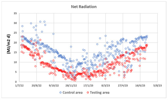 From the data obtained with the model used for estimating the net radiation in the testing area [22], the average value resulted 44% lower than in the control area, with differences in winter months (−60% in February) higher than in the summer ones (−19%). The average net radiation of the whole sampling period was 15 MJ/m2 d in the control area and 9.0 MJ/m2 in the testing area (Figure 4).