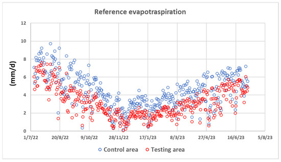 All these data have been used for calculating ET0 [23]. From the analysis of the data (Figure 5) during the 2022–2023 season, the total ET0 has been 1.622 mm per year in control area and 1.149 mm in the testing area. Therefore, the reduction of the wind speed and of the net radiation in the testing area caused a 29% decrease of ET0, corresponding to 474 mm.