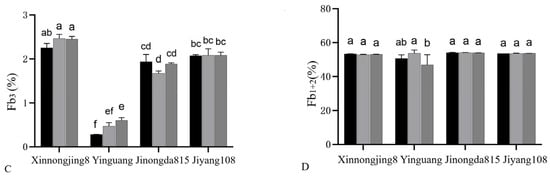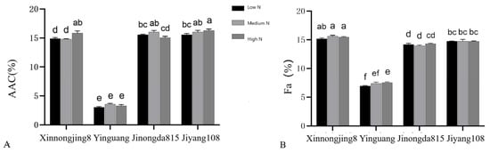 The cooking and eating quality of rice mainly depends on its starch properties and protein components. Therefore, nitrogen fertilizer application can improve the eating quality of rice mainly by affecting these two main physicochemical indexes [,]. In this study, nitrogen application significantly affected the amylose content, and a relationship between variety and fertilization level was observed (Table S1). The AAC of the high albumin content varieties increased with an increase in nitrogen application, whereas the AAC of the low glutelin content varieties fluctuated with an increase in nitrogen application, possibly due to the competitive relationship between the protein and amylose contents of rice (Figure 1). Previous studies have shown that nitrogen can change the content and structure of amylopectin in rice as well as increase the proportion of short chains; however, it is unsuitable for the formation of long chains []. The Fa and Fb3 of Xinnongjing8 and Yinguang in this study increased with an increase in nitrogen application. For potatoes, studies have shown that the amount of nitrogen fertilizer application significantly affects the expression of the starch synthetase gene SSIII; reasonable nitrogen fertilizer application can increase SSIII expression level []. Therefore, in this study, did the application of rice panicle fertilizer increase the expression level of SSIII and promote the synthesis of long-chain amylopectin? To answer the above question, further investigation is needed. In general, nitrogen application significantly affected the branch structure of amylopectin of the high albumin content variety Yinguang, whereas the AAC of the other three varieties differed significantly in response to nitrogen fertilizer.