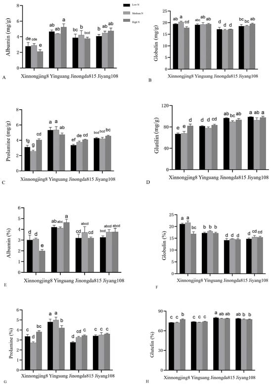 Effects of nitrogen fertilizer on protein composition and proportion of different rice varieties. (A): Differences of albumin content in four varieties with different nitrogen application levels, (B): Differences of globulin content in four varieties with different nitrogen application levels, (C): Differences of prolamine content in four varieties with different nitrogen application levels, (D): Differences of glutelin content in four varieties with different nitrogen application levels. (E): Differences of albumin percentage in four varieties with different nitrogen application levels, (F): Differences of globulin percentage in four varieties with different nitrogen application levels, (G): Differences of prolamine percentage in four varieties with different nitrogen application levels, (H): Differences of glutelin percentage in four varieties with different nitrogen application levels. Note: The different letters indicate that the difference is significant at 0.05 level.
