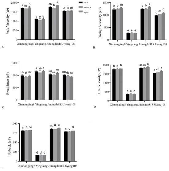 Effect of nitrogen fertilizer on RVA characteristic values of different rice varieties. (A): Differences of peak viscosity in four varieties with different nitrogen application levels, (B): Differences of trough viscosity in four varieties with different nitrogen application levels, (C): Differences of breakdown in four varieties with different nitrogen application levels, (D): Differences of final viscosity in four varieties with different nitrogen application levels, (E): Differences of setback in four varieties with different nitrogen application levels. Note: The different letters indicate that the difference is significant at 0.05 level.