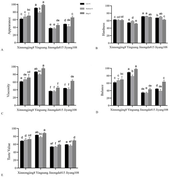 Effects of nitrogen fertilizer on eating quality of different rice varieties. (A): Differences of appearance in four varieties with different nitrogen application levels, (B): Differences of hardness in four varieties with different nitrogen application levels, (C): Differences of viscosity in four varieties with different nitrogen application levels, (D): Differences of balance in four varieties with different nitrogen application levels, (E): Differences of taste value in four varieties with different nitrogen application levels. Note: The different letters indicate that the difference is significant at 0.05 level.