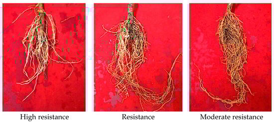 When Massilia was grafted onto CRS-1, CRS-8, CRS-11, CRS-12, CRS-13, CRS-14, CRS-15, CRS-21, CRS-22, and CRS-24, it exhibited an RKI of 1, indicating a highly resistant reaction. Similar results were seen by Morra and Bilotto [], Galvez et al. [], Fernandez et al. [], and Lopez et al. []. The self-grafted plants displayed an RKI of 2, signifying a resistant reaction. The non-grafted plants recorded an RKI of 3, indicating a moderately resistant reaction. This moderate resistance suggests that while the scion alone possessed some resistance, it may be less effective in preventing nematode infestation compared to the highly resistant rootstocks when used in grafting. Though similar comments have been noted by Lopez et al. [], contrary findings were observed in the study conducted by Kokalis et al. [], wherein the self-grafted plants had more root galls compared to non-grafted plants.