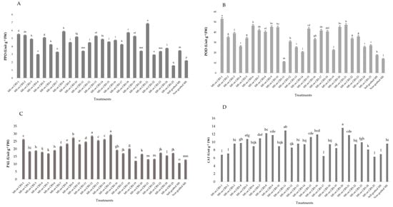 Activity of antioxidant enzymes such as PPO (A), POD (B), PAL (C), and CAT (D) at the onset of disease incidence in different graft combinations of bell pepper plants under challenge inoculation conditions. (p < 0.01). Different letters reveal significant differences according to Duncan’s test, p = 0.05. PAL: phenyl ammonia lyase, POD: peroxidase, PPO: polyphenol oxidase, CAT: catalase. Y-axis indicates antioxidant enzyme activity. X-axis indicates the different graft combinations.