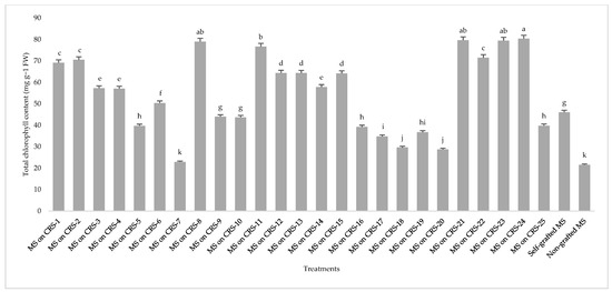 The antioxidant enzyme activity analyzed in leaves varied significantly among the grafting treatments (Figure 2). PPO activity ranged from 1.57 to 6.87 unit/g FW, being the highest in the plants grafted onto CRS-21 and the lowest in CRS-25 (Figure 2A). POD activity ranged from 11.07 to 53.10 unit/g FW, with CRS-1 exhibiting the highest and CRS-11 showing the lowest (Figure 2B). PAL activity ranged from 10.61 to 29.23 unit/g FW, being the highest in the plants grafted onto CRS-15 and CRS-12 and the lowest in the non-grafted Massilia (Figure 2C). CAT activity varied from 6.28 to 13.55 unit/g FW, with the highest activity in the plants grafted onto CRS-20 and lower levels in the self-grafted plants and certain other graft combinations (Figure 2D). The total chlorophyll content ranged from 21.56 to 80.42 mg/g FW, with the Massilia grafted onto CRS-24 displaying the highest content and lower levels being displayed in the plants grafted onto CRS-7 and the non-grafted plants (Figure 3).