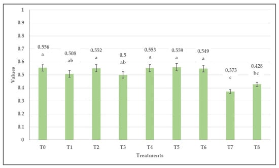 The NDVI values of plants treated with flumioxazin (T1), pendimethalin (T2), dimethenamid-P (T3), pethoxamid (T4), clomazone (T5), and metobromuron (T6) did not differ significantly from the NDVI values of control plants. Box plots of the dataset show the data distribution and significant differences at three levels in Figure S1.