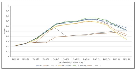 NDVI datasets were collected 12 times with the Trimble GreenSeeker HCS-100 (Trimble Inc., Sunnyvale, CA, USA) manual device. The range of these vegetation indices is from 0 to 1; for example, an NDVI value above 0.82—measured in control plots—is considered to indicate a good health status in Andean lupine (Lupinus mutabilis Sweet.) [39]. Additionally, normalized difference vegetation index (NDVI), green normalized difference vegetation index (GNDVI), and enhanced normalized difference vegetation index (ENDVI) datasets were collected using the Phantom 4 pro-UAV’s six-channel camera system (SZ DJI Technology Co., Ltd., Shenzhen, China). Measurements were made at BBCH 3.4 (open flower phase) and BBCH 4.2 (50% of the space between the septa is occupied by seeds) on the 2 and 24 June, respectively. These dates were very close to dates of manual measurements.