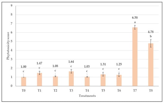 Means of visually assessed phytotoxicity scores in plots treated by different herbicides. Each bar shows the mean and standard error of the dataset. Different letters indicate significant differences between means of treatments (Tukey Post Hoc Test; p < 0.05).