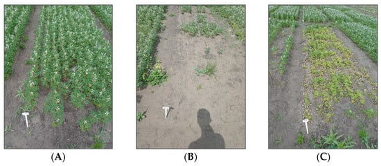 The plot treated by flumioxazin (A), the plot treated by metribuzin (B), and the plot treated by imazamox (C). Photos were taken on 1 June (55 days after sowing).