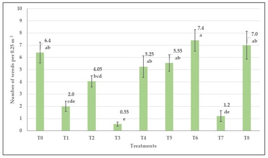 Based on the weed survey results, metobromuron (T6) was the least effective against weeds in the experimental area (Figure 8); however, it did not differ from the control (T0), pethoxamid (T4), clomazone (T5), and imazamox (T8). The active substance dimethenamid-P (T3) was the most effective for weed suppression, followed by the metribuzin (T7) and then the flumioxazin (T1) treatments, resulting in significantly lower results than the majority of other treatments (F(8, 68.5) = 25.4, p < 0.001). Box plots of the dataset show the data distribution and significant differences at three levels in Figure S5.