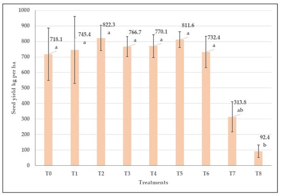 Means of net seed yields in different treated plots. Each bar shows the mean and standard error of the dataset. Different letters indicate significant differences between means of treatments (Tukey Post Hoc Test; p < 0.05).