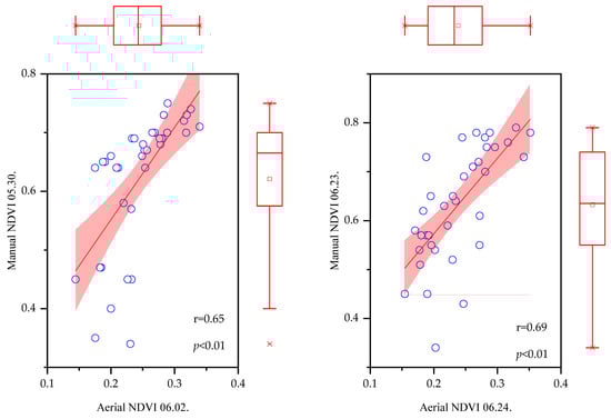 A significant correlation (p < 0.01) was found between the values of aerial and manual NDVI measurements when the recording dates were very close (Figure 12). A significant correlation value (r = 0.65) was obtained between the NDVI values recorded with the manual device on 30 May and those recorded with the UAV spectral camera on 2 June. The mean and median of the 2 June UAV values are much closer to each other than the mean and median of the NDVI values recorded manually. There was a similar correlation (r = 0.69) between the values measured by the manual device on 23 June and the values measured by the aerial method on 24 June, although these measurement dates were closer to each other. The negative directional standard deviation of the manual recordings on the charts is substantially larger than that of the aerial recordings.