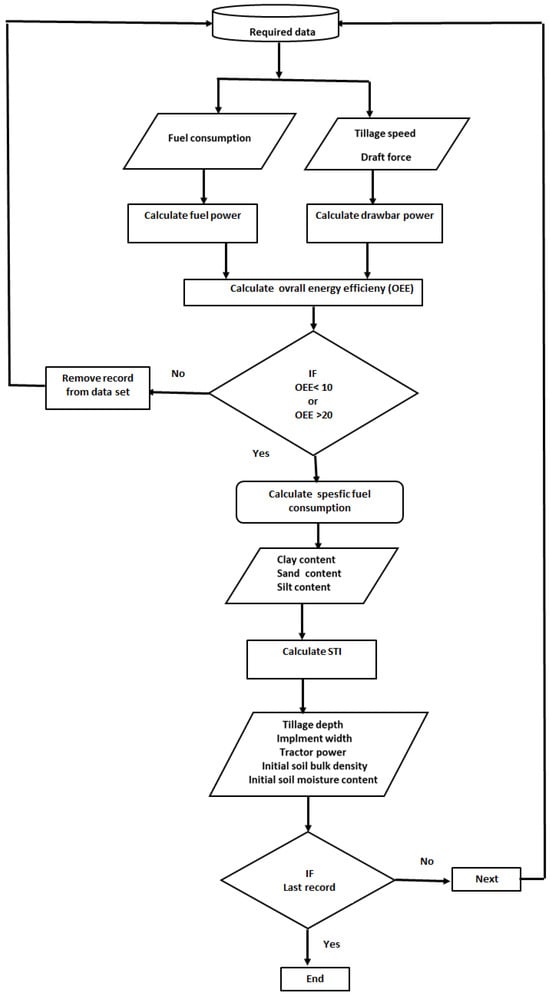 The workflow for the research steps to attain values of specific fuel consumption from the literature data is shown in Figure 1. However, Table 1 and Table 2 depict the statistical criteria of the collected dataset from previous research studies for chisel and moldboard plows, respectively.