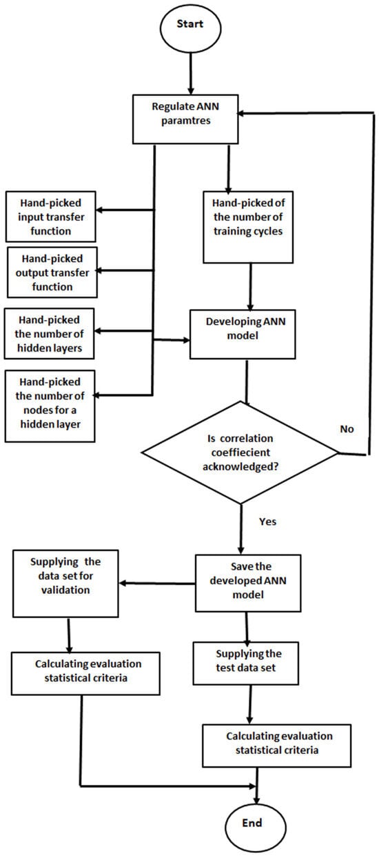 where NV is the input or output normalized vector (however, NVmax is 0.85 and NVmin is 0.15), and V, Vmax, and Vmin are the original data, the maximum value, and the minimum value of input or output data. The initial weights and biases of the neurons were chosen at random by the algorithm. There were 397 patterns in the training dataset, 100 data points in the testing dataset, and 3 data points in the validation dataset.
