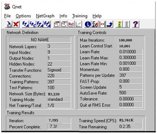 Using Qnet v2000, simulations were run. Differential attempts led to the selection of MLP with a single hidden layer as the ANN architecture. The input layer was composed of nine nodes (tractor power, initial soil bulk density, soil texture index, plowing depth, plowing speed, implement width, initial soil moisture content, chisel plow, and moldboard plow). During the ANN model development process, the number of neurons in the hidden layer was set to a range from one to thirty. The activation functions of neurons were sigmoid and hyperbolic tangent. Initial weights and biases of neurons were chosen randomly. The developed ANN model training speed was 85,761 K after being trained 100,000 times. During the ANN learning cycle, the network data were trained in order to ascertain the number of neurons and modify the weight coefficients in each neuron [43]. The final network included one hidden layer that included 22 neurons, 9 neurons for the input layer, and 1 neuron for the output layer, and the activation function was sigmoid. These values were achieved after multiple attempts to change the network topology and 7295 iterations.